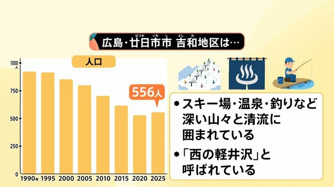 実は吉和地区、「西の軽井沢」と呼ばれていて、スキー場や温泉、釣りなど非常に豊かな観光資源もある地域です。ただ一方で、非常に過疎地域で、人口が減っており、2025年現在は556人しか暮らしていません。