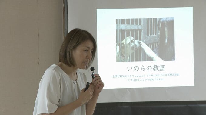 講師は広島県の高校教員で、動物愛護について出前授業もしている山下育美さんです。山下さんは飼い主が手放したイヌやネコが動物愛護センターに収容され、新しい飼い主と出会えなかったら処分されてしまうと話していました。