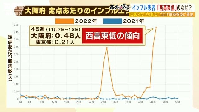 ―――大阪府の「定点あたりのインフルエンザ患者の報告数」を示しています。まず青い線、2021年のインフルエンザの患者報告数は相当少ないいっぽう今年は(オレンジ色の線)、ここで1回ぐっと上がって、落ち着いたあと、11月7~13日の週に一気に増えています。大阪は0.48人で東京の0.21人と比べて倍以上多く、インフルエンザは「西高東低の傾向」です。しかし大阪がこれだけ多いというのはなんでなんでしょう。