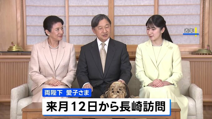 天皇皇后両陛下と長女・愛子さまが「戦後80年」にあたり、来月、長崎県を訪問されると宮内庁が発表しました。宮内庁によりますと、両陛下と愛子さまは来月12日から長崎県を訪問されます。ご一家は長崎市の平和公園…