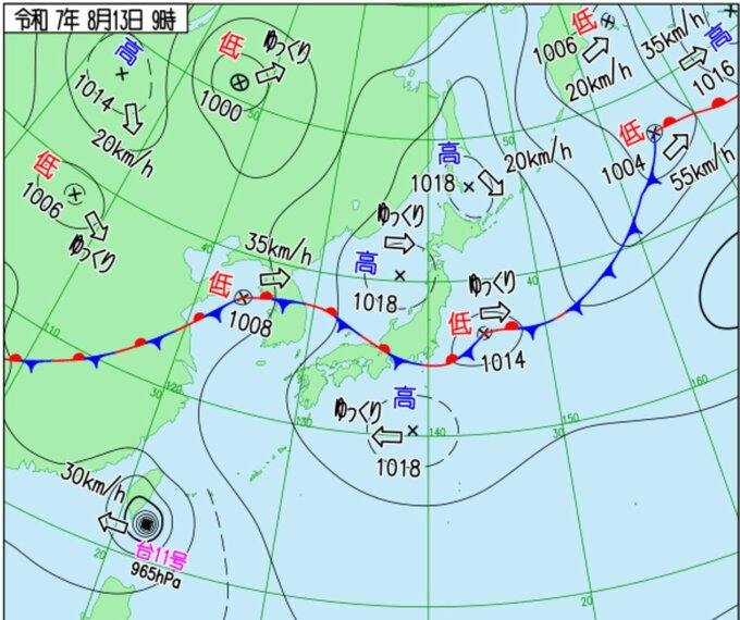 13日は日本の南で地上の高気圧が顕在化し、14日にかけて東シナ海へ移動、15日は黄海付近に停滞する予想です。