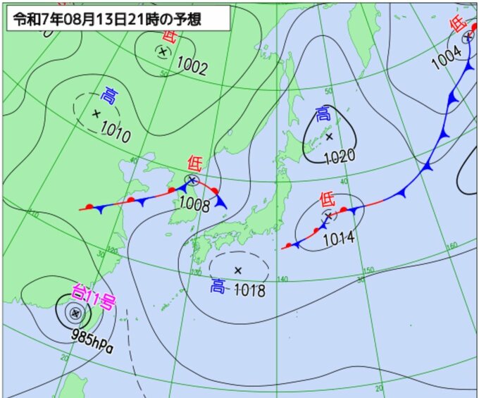 13日は高気圧の影響で本州付近では前線が次第に不明瞭化します。一方、13日朝までに前線上の黄海付近に低気圧が発生し、14日にかけて日本海を東北東進する見込みです。この低気圧は15日は日本海から北海道付近を通ってオホーツク海へ進み、シアーラインが北日本から東日本を通過します。
