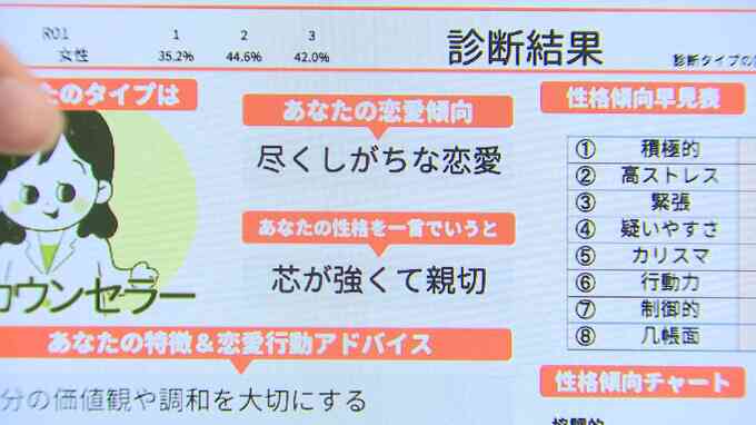 RKB下濱美有「診断結果が出ました。かなり細かく性格や恋愛傾向が出ます。私は尽くしがちな恋愛、性格は芯が強くて親切。ちょっと意外でしたね」