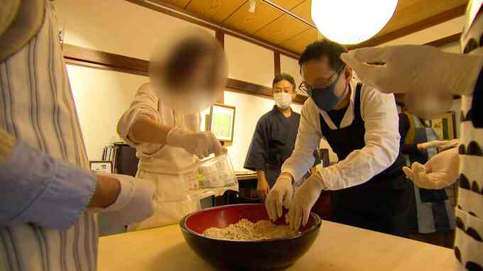 初対面の参加者は協力しながらそば作りに挑戦する。ぎこちない大塚さんに思わず女性陣が突っ込む。