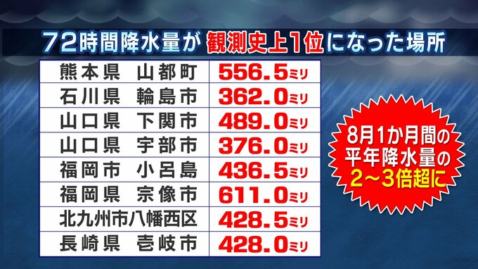 観測史上最も多い72時間降水量を8地点で観測し、いずれも8月1か月の平年雨量の2~3倍以上の雨量です。
