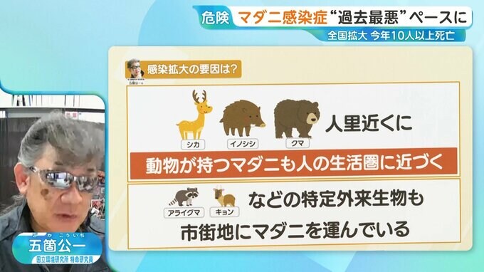 また、アライグマ・キョンなどの特定外来生物も、市街地にマダニを運んでいるとみられています。