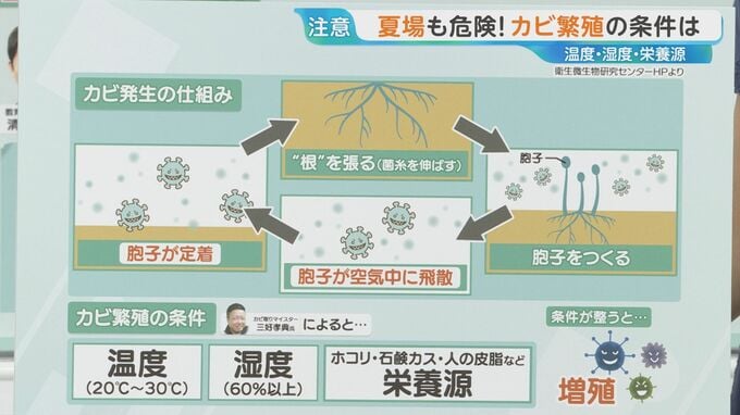 空気中に飛散しているカビの胞子が定着し、根(菌糸)を張って大きくなり再び胞子を空気中に飛ばします。この循環でカビは増えていきます。(株式会社衛生微生物研究センターHPより)