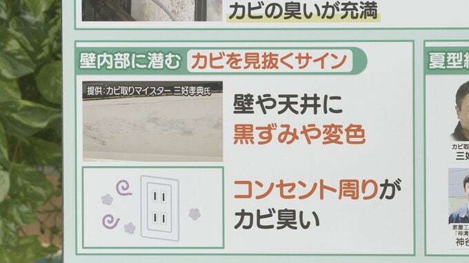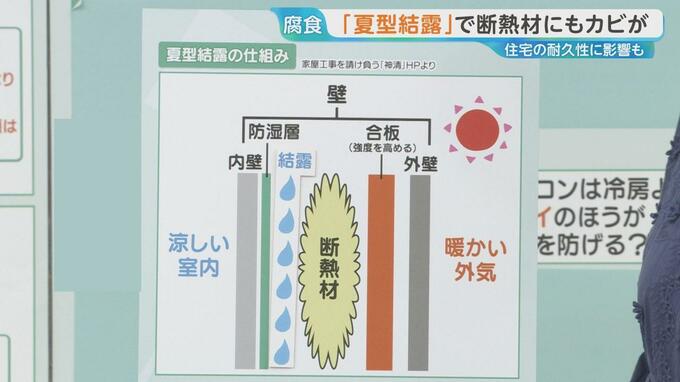 夏は、部屋の中が涼しく外は暑い環境です。しかも夏は空気中の水分量が冬の4倍になっています。エアコンの冷気で冷えた壁の中、見えないところで結露が起こるのです。