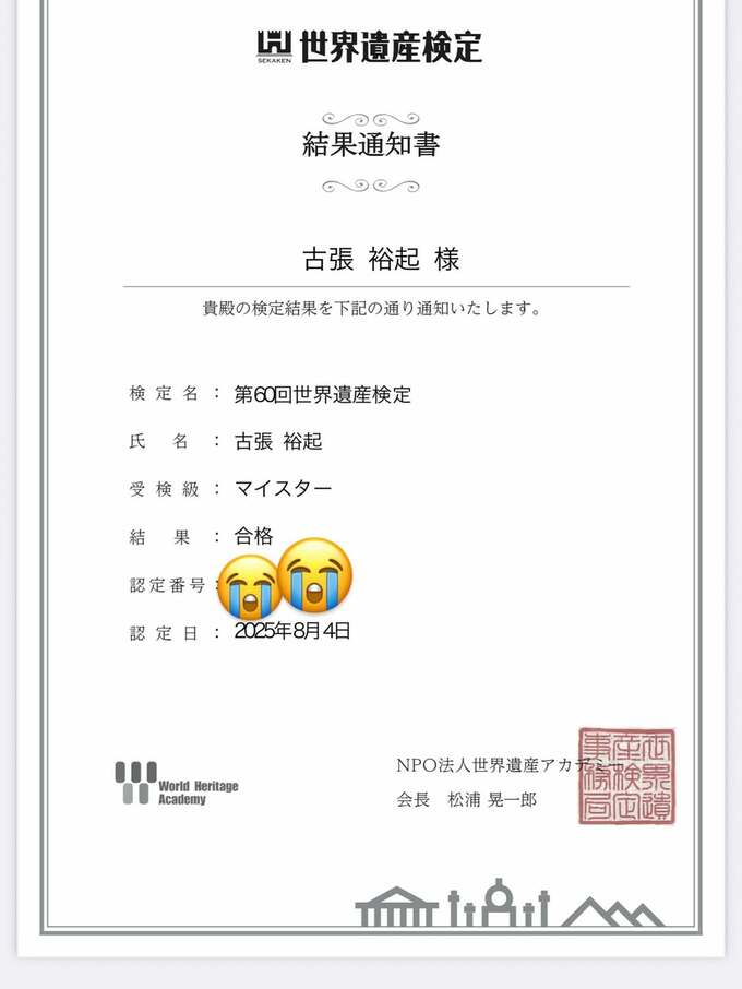 掲載された合格通知書には、あばれる君の本名である「古張裕起」宛てに、第60回世界遺産検定マイスターの合格が認められたことが記されています。認定日は2025年8月4日で、通知書にはNPO法人世界遺産アカデミーと印鑑が押されています。
