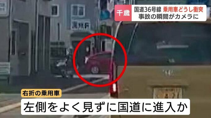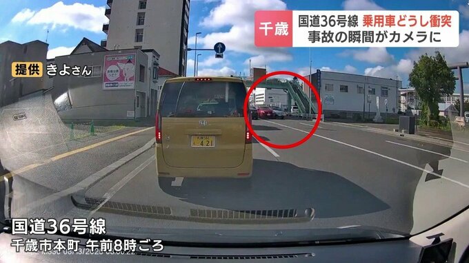 13日午前8時ごろ、千歳市本町の信号のない丁字路交差点で、右折しようとした赤い乗用車が、直進してきたグレーの乗用車と衝突しました。