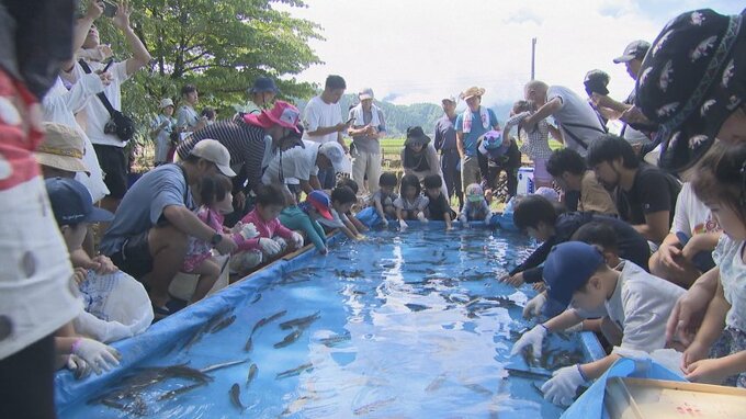 富山県入善町でお盆休み恒例の魚のつかみ取り大会が開催され、子どもたちがイワナやヤマメのつかみ取りに挑戦しました。