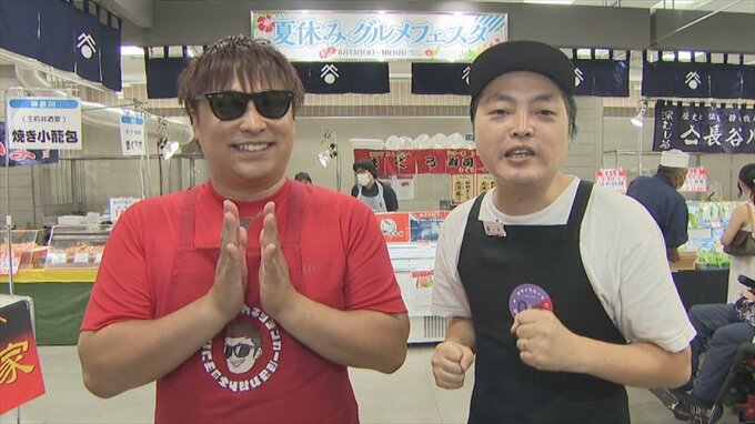 甲府市の岡島でお盆期間中で初めてとなる物産展が開催されています。弁当やスイーツなど全国の逸品がそろう中、お笑い芸人が手がける店も人気を集めていました。はまやねんさん:「ラッスンゴレライ♪おいしいカレ…