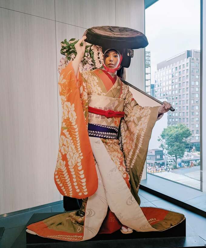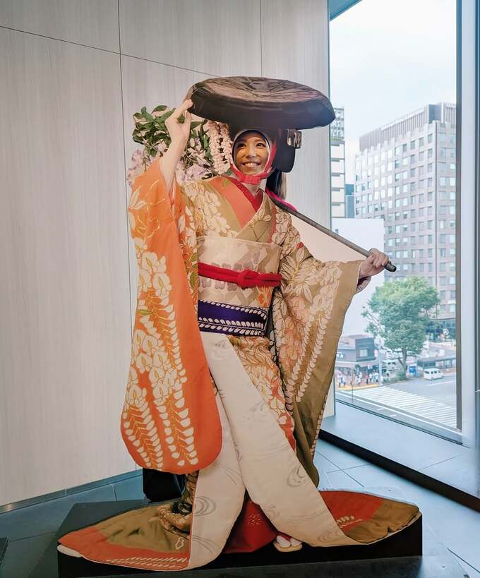 さらに若槻さんは、映画『国宝』にも登場するか華やかな着物が描かれた“藤娘”の顔はめパネルの写真も投稿。鮮やかなオレンジと金色の和服に白い花柄がデザインされた着物姿で、手には伝統的な菅笠を持ち、笑顔でポーズを取っています。