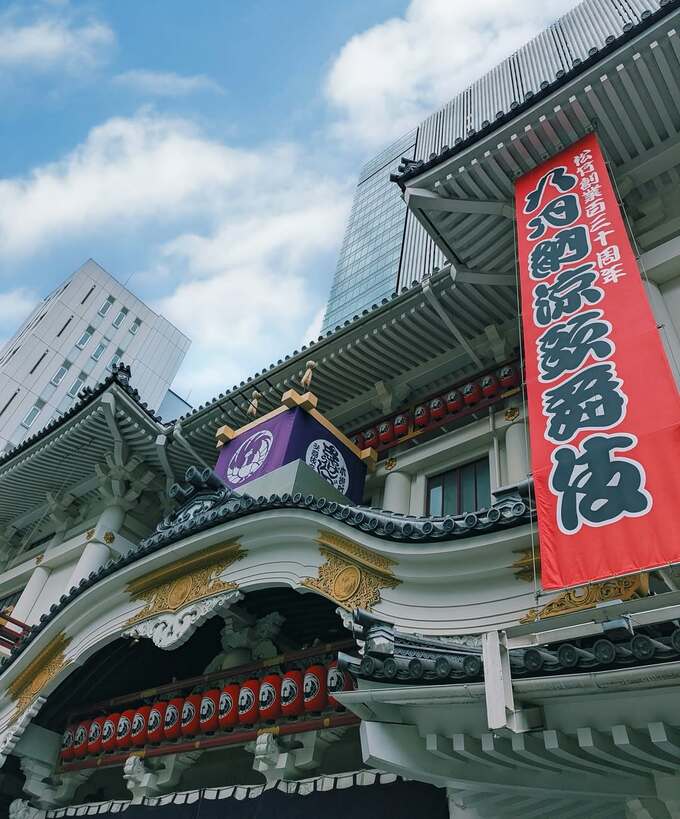 会場となった歌舞伎座は、「八月納涼歌舞伎」の赤い垂れ幕が掲げられていました。