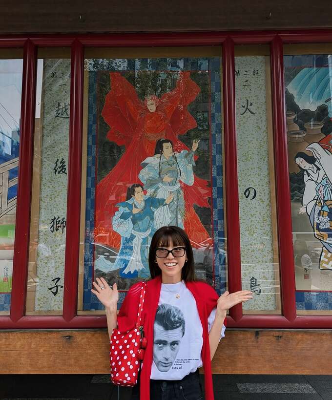 投稿された写真からは、若槻さんが赤い服を羽織り白いTシャツ、黒いパンツを着用し、カラフルな歌舞伎ポスターの前で微笑む姿が確認できます。