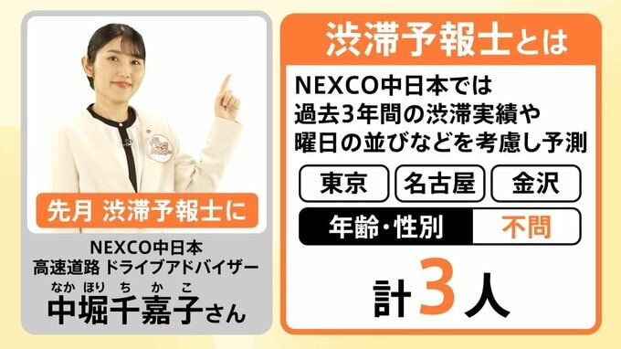 NEXCO中日本では、過去3年間の渋滞実績や曜日の並びなどを考慮して予測を出しています。年齢・性別は不問で、東京・名古屋・金沢で、それぞれ1人ずつ、計3人います。
