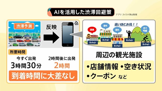 活用してみると便利なアプリがあります。ここ2年ほどで新たに開発された、「AIを活用した渋滞回避策」です(アプリ:スイスイ旅山梨版)。