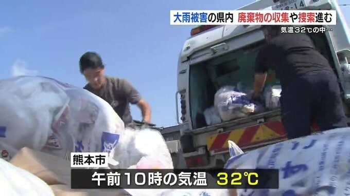 記録的な大雨から3日目を迎えた熊本県では、朝から気温が32℃に上る中、安否不明者の捜索活動や災害廃棄物の収集などが進められています。記者「熊本市中央区のごみステーションです。家具や畳など災害廃棄物が山…