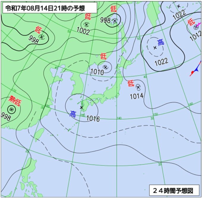 日本の南の高気圧は14日は西日本へ、15日から16日は黄海付近へ移動する見込みです。また、15日午後には日本海に別の高気圧が現れ、東へ移動します。