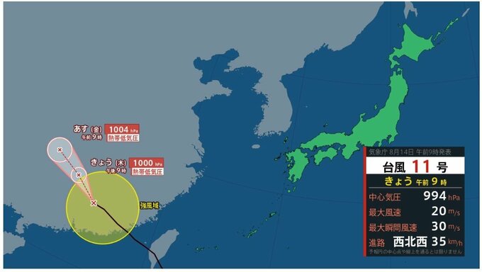 台風11号が台湾海峡付近にあって西北西に進んでいます。この台風は華南を西北西に進み、14日午前には熱帯低気圧に変わる見込みです。沖縄地方からは次第に遠ざかりますが、うねりを伴い波が高くなる所があります。先島諸島では14日は、うねりを伴った高波に注意してください。