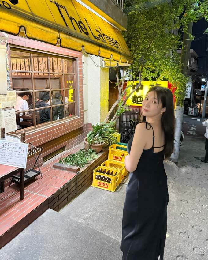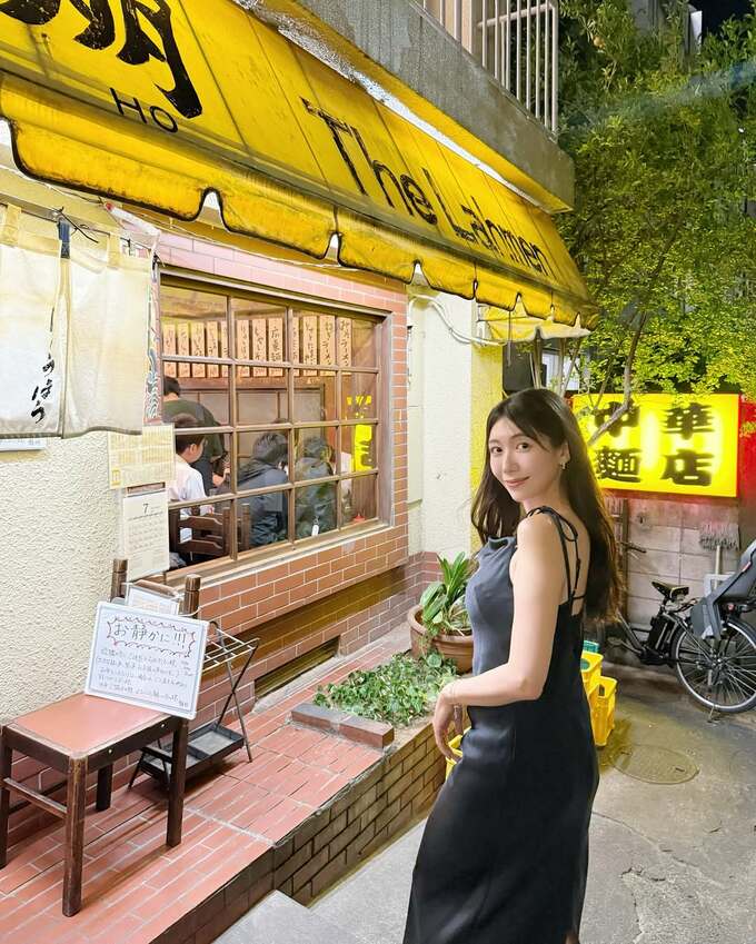 穂川さんは黒いドレスを着用し、「The Lahmen」という黄色い看板が特徴的な町中華の前で撮影。店内は多くの人で賑わっている様子が窓越しに見えます。