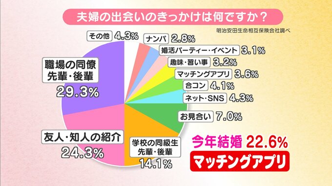 ちなみに「今年結婚した夫婦」に限定すると、割合が22・6%に急上昇するのがあります。それが「マッチングアプリ」です。スマホの普及やコロナ禍の影響が考えられるということです。