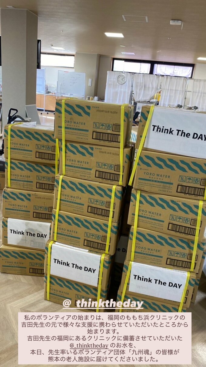 また3枚目の投稿では、自身のボランティア活動の端緒となった経験を書き添えつつ「吉田先生の福岡にあるクリニックに備蓄させていただいた@_thinkthedayのお水を」「本日、先生率いるボランティア団体『九州魂』の皆様が熊本の老人施設に届けてくださいました。」と公表。栃木県を拠点にする「Think The DAY」が福岡の団体と “離れていても連携している” 様子を知らせています。