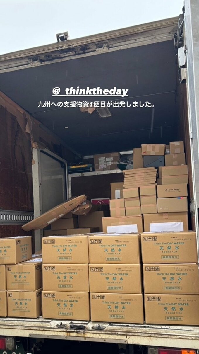 紗栄子さんは「九州への支援物資1便目が出発しました」と文字を乗せたトラックの荷台の写真をストーリーズに投稿。積まれている箱には「天然水」「長期保存水」と明記してあるものが多く、その他の物資も積み込まれているようです。