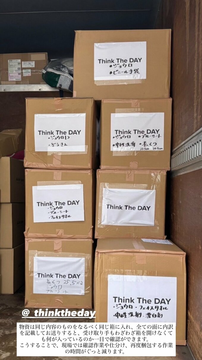 2枚目の投稿では、積まれた箱に「Think The DAY」と印刷された紙が貼ってあり、それぞれの紙に箱の中の内容物が手書きで書かれています。「・ジョウロ・ビニール袋」「・ジョウロ・ブルーシート・フェイスタオル」など、事細かに記されています。