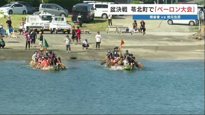 お盆休みに帰省した人と地元住民によるペーロン大会が熊本県苓北町で開かれ、熱戦が繰り広げられました。