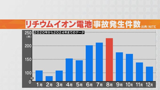 車内に置いてあったモバイルバッテリーが突然、爆発する様子を捉えた映像。工業製品などの安全性を調べるNITE(ナイト)の調査によると、リチウムイオン電池を使った製品の事故は気温が上がる夏場に多く、月別にみると8月が最多です。