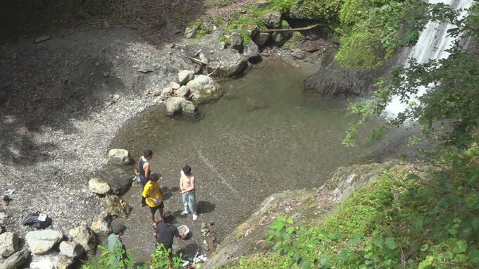 14日は県外からの観光客が滝つぼで泳いで涼を感じていました。