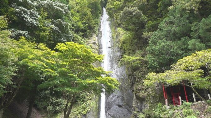 落差約55m、生い茂る木々の間から岩肌を滑り落ちる細身の滝は訪れる人を魅了します。