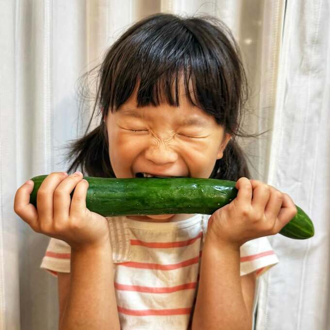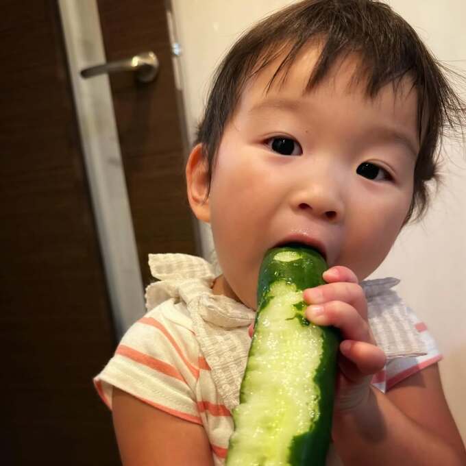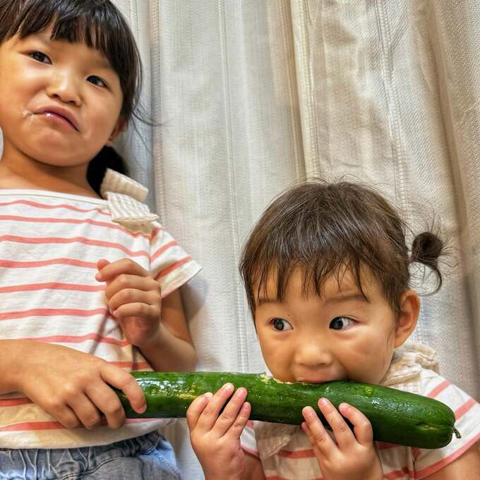 続いて、ののちゃんが妹のひーちゃんにきゅうりを渡して、そのきゅうりそのものにひーちゃんがかじりついている様子を投稿。二人のカラダに比べてきゅうりはとても大きくて、ののちゃんの様子に「まるかじり!!!とうもろこしみたいになりました」と驚いています。