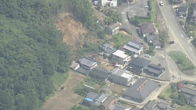 記者「2階建て瓦屋根の家に土砂崩れ、木が流れ込んでいます。かなり広い範囲で土砂崩れが起きています」