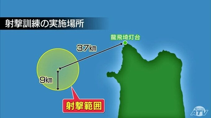 巡視船「おいらせ」の射撃訓練が行われたのは、龍飛埼灯台から南西に約37kmの地点を中心にした半径9kmの海域です。