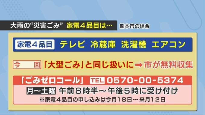 これまでは、テレビと冷蔵庫、洗濯機、エアコンの家電は収集の対象外でしたが、大雨で被害を受けたものは「大型ごみ」と同じ扱いとなり、「ごみゼロコール」に申し込めば、市が無料で引き取ります。