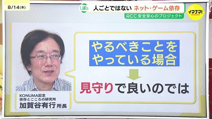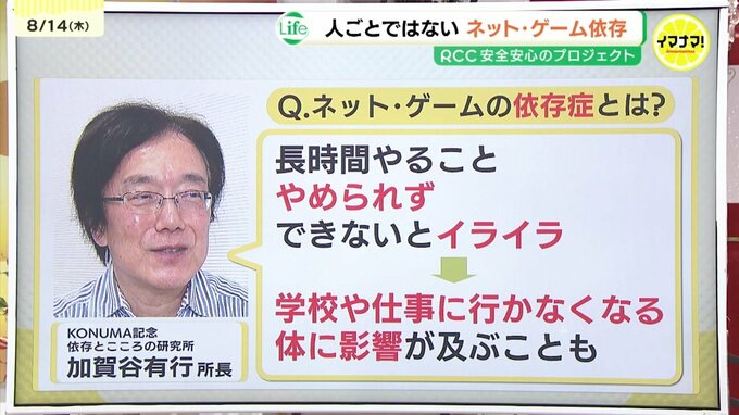 KONUMA記念依存とこころの研究所 加賀谷 有行 所長は「実生活で学校の中で嫌なことがあったり、家庭の中でいやなことがあったりすると、それでゲーム、ネットの方に気持ちが向かっていってしまって、次第に止められなくなるということもあるかと思う」と話します。