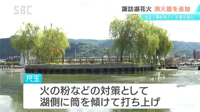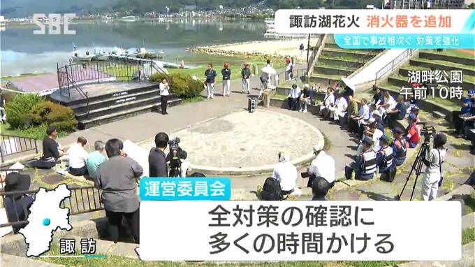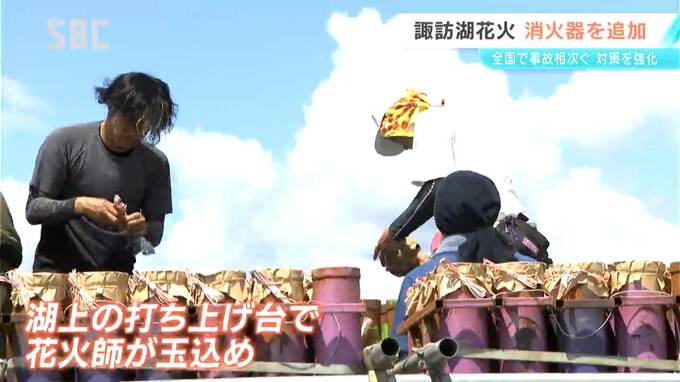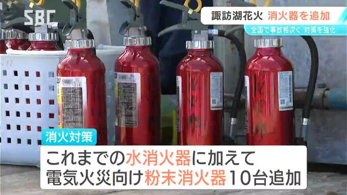 あす(15日)は恒例の諏訪湖の花火大会が開かれます。今年は全国で花火大会での事故が相次いでいることから、新たな消火器を購入するなど安全対策を強化して本番に備えています。