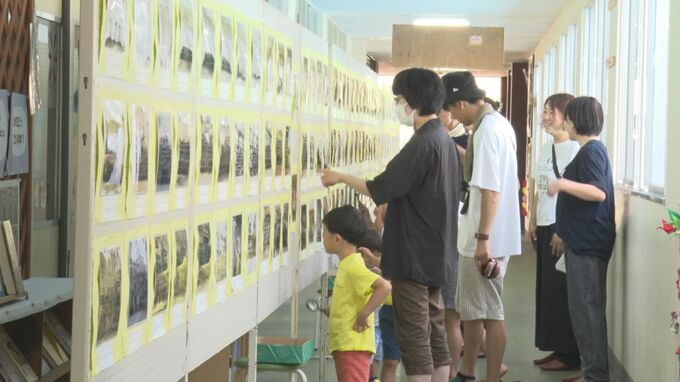 廊下に展示された卒業写真を懐かしそうに眺める人たち。