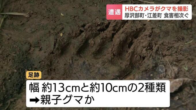 田んぼには幅約13センチのものと幅約10センチの2種類の足跡が残され、警察は親子グマのものとみています。