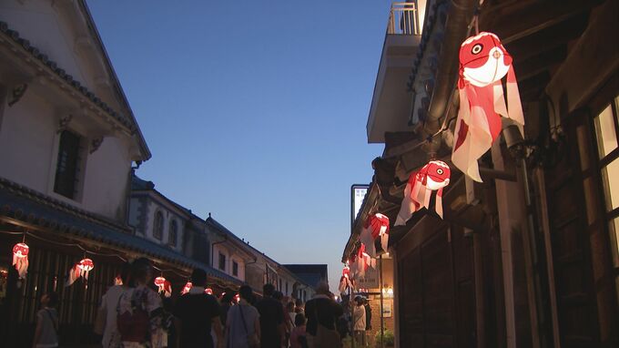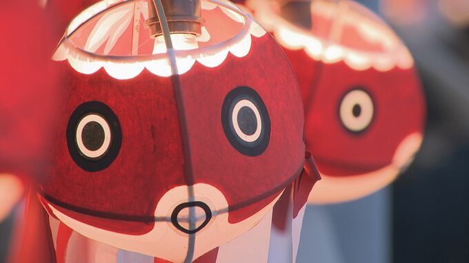 日が落ちてくると、まちなかに飾られたおよそ2500個の金魚ちょうちんに明かりがともります。