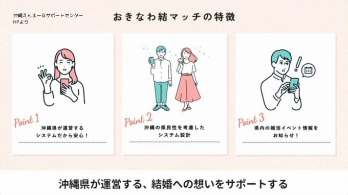 少子化対策の一環として運用するもので、県が県民の婚活を支援する「沖縄えんまーるサポートセンター」をオンライン上で開設。出会いの場を提供するマッチングシステム「おきなわ結(ゆい)マッチ」の運用などを手がけます。