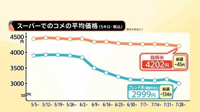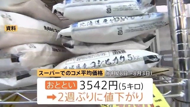 12日に発表された「スーパーでのコメの平均価格(7月28日~8月3日)」は3542円(5キロ)、2週ぶりに値下がりとなりました。