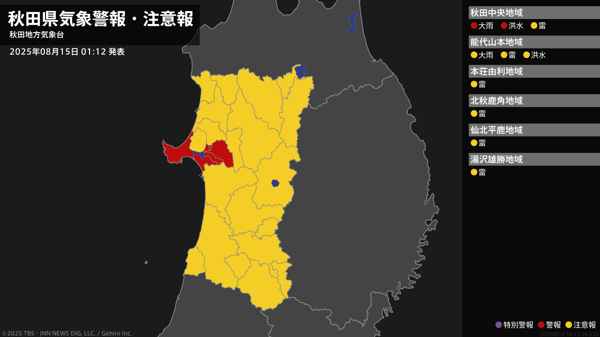 気象台は、午前1時12分に、洪水警報を五城目町に発表しました。また大雨警報(浸水害)を男鹿市、八郎潟町、井川町に発表しました。