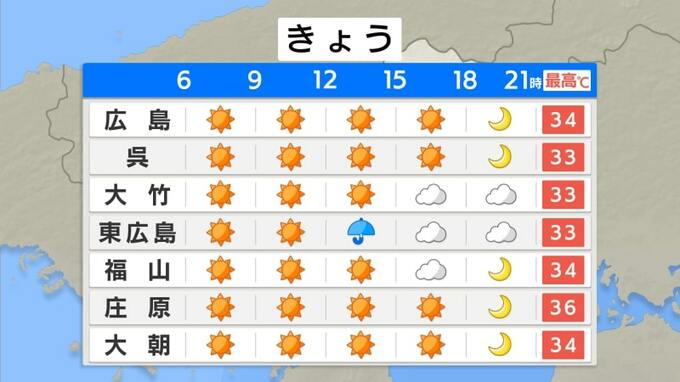 このあともおおむね晴れますが、午後は強い日射と湿った空気が流れ込みやすくなる影響で、局地的な激しい雷雨に注意が必要です。日中の予想最高気温は、加計で37℃~38℃ 三次や府中市・庄原で36℃~37℃近くまで上がる見込みです。広島市中区は35℃予想で、各地危険な暑さになります。お盆休みも後半で、レジャーなどの予定があると思いますが、長時間の屋外の活動はできるだけ控えていただき、室内にいる際も適切にエアコンを使用するようにしてください。