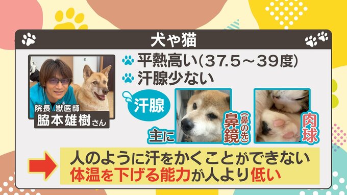脇本院長によりますと、イヌやネコは平熱が高く37.5~39度ほど。汗腺が少なく、主に鼻鏡という鼻の先と肉球にしかありません!人のように汗をかくことができないため、体温を下げる能力が人よりも低いそうです。