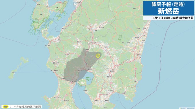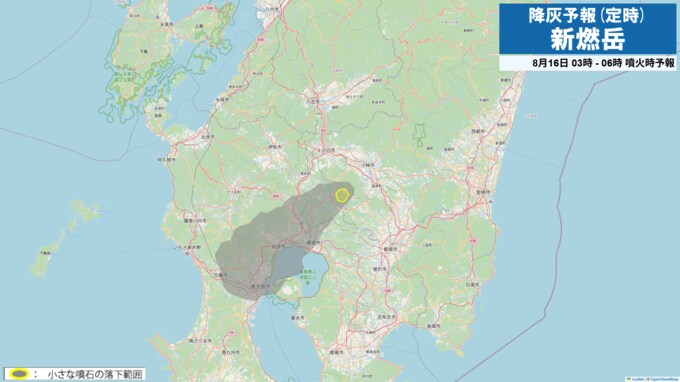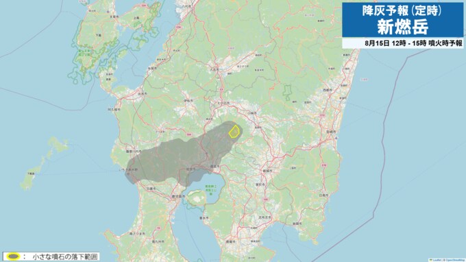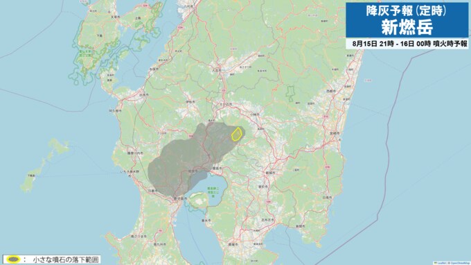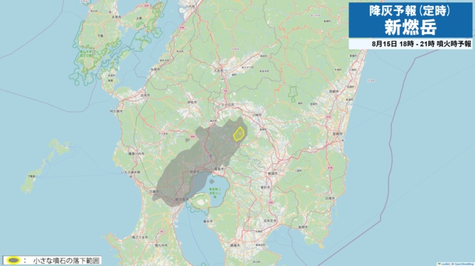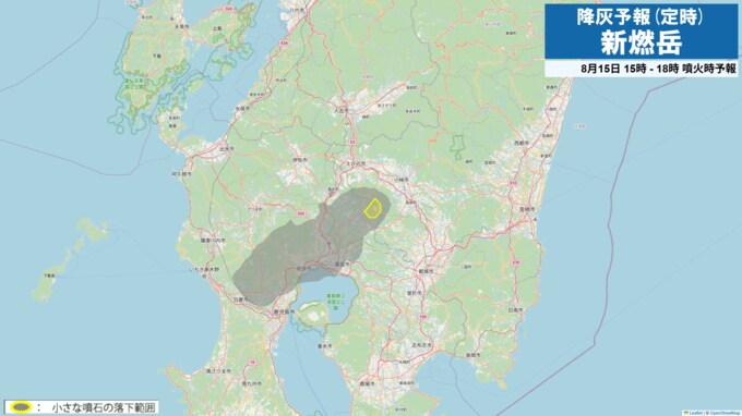 新燃岳で噴火が発生した場合には、15日21時から24時までは火口から南西方向に降灰が予想されます。