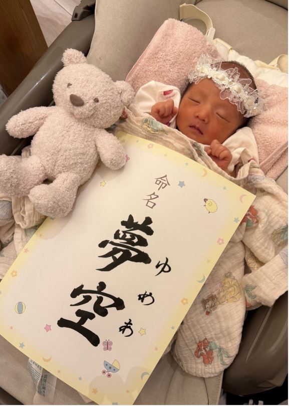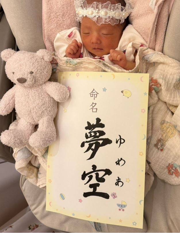 公開された画像では、レースのヘッドバンドを身につけた夢空ちゃんが、ベビーベッドで眠る姿が写っています。胸元には「命名 夢空(ゆめあ)」と書かれた紙が置かれ、星や月のイラストで彩られています。