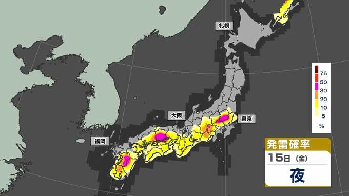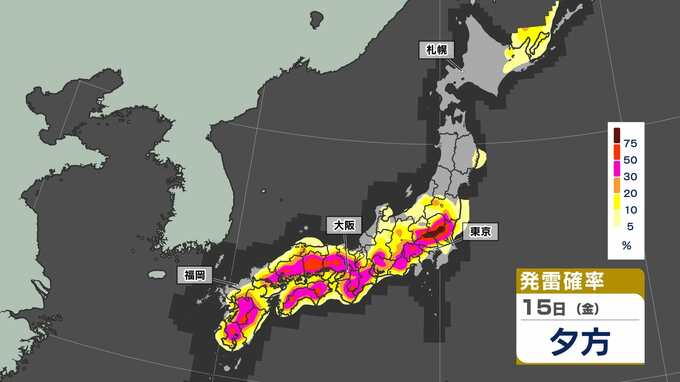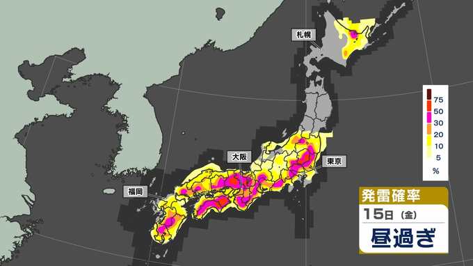 発雷確率が75%以上のところもあり、大気の状態は非常に不安定です。発雷確率のシミュレーションは画像で確認できます。